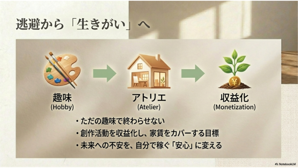 アトリエという居場所ができたことで、夫婦間のトラブルも避けることができるし、