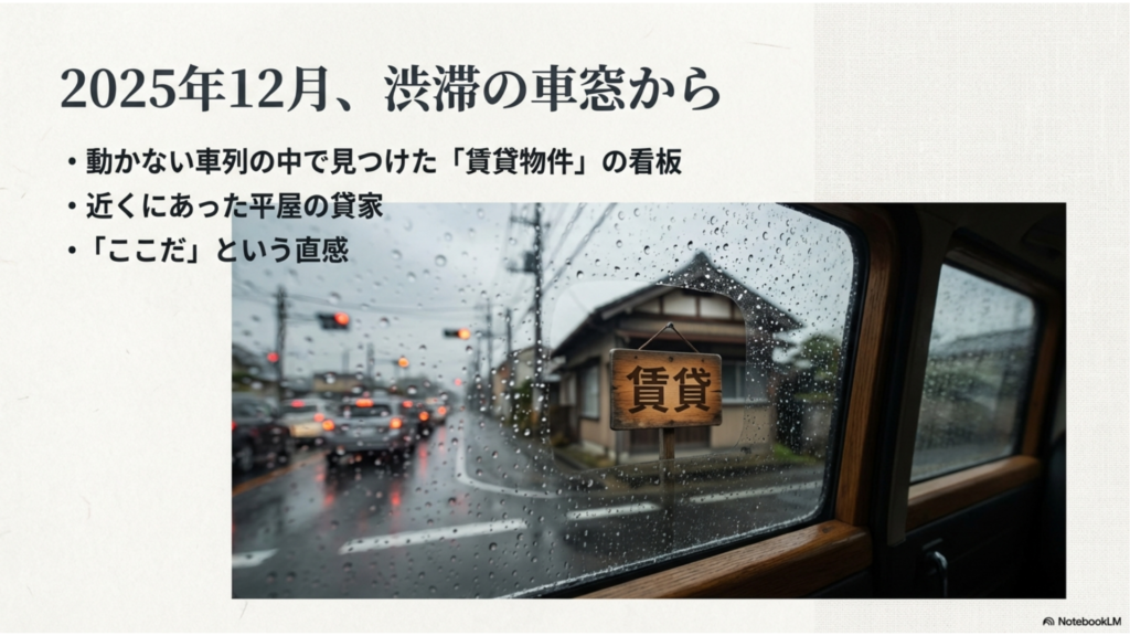 転機は2025年12月、突然訪れました。渋滞で車が止まったとき、ふと横を見ると「賃貸物件」の看板が。